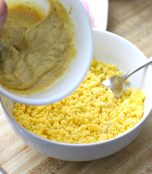 Cut eggs in half lengthwise. Scoop yolk out and mask with fork.