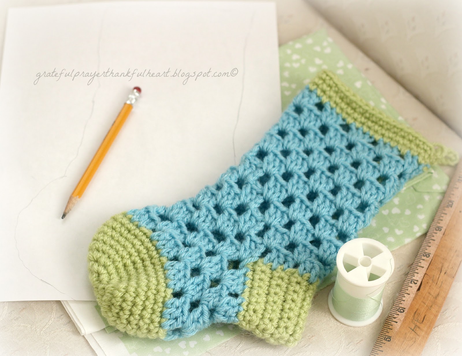 Aren’t the blue and green colors cute together? Of course, you can make a stocking in any color(s) you like.