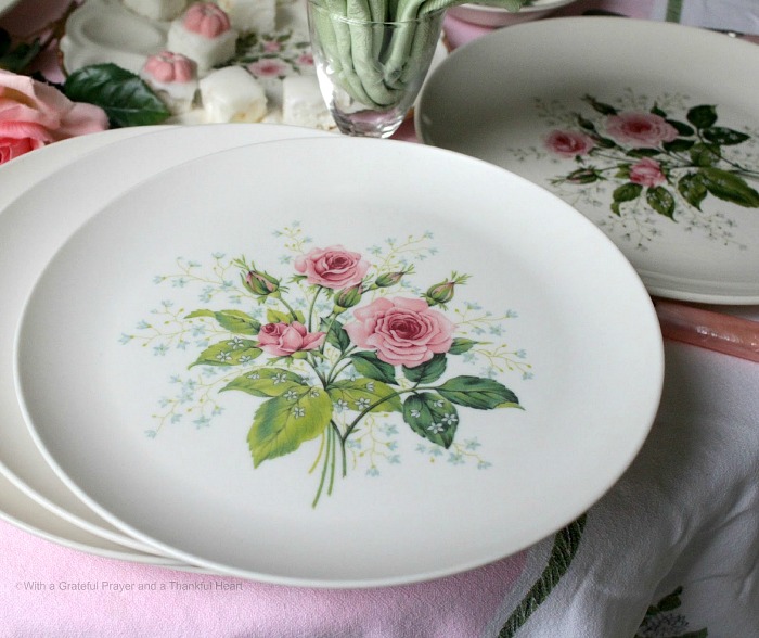 These three dinner plates were used when I was growing up. They are melmac and I remember well standing by a sink full of suds, washing each plate and thinking how pretty they were.