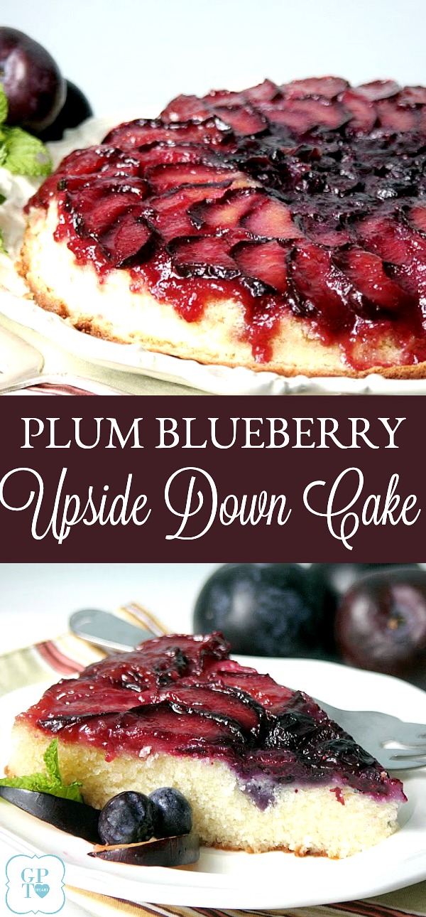 Looking to use some plums ripening on the counter, I searched and found this very colorful Plum Blueberry Upside Down Cake recipe. Thinly sliced plums surround a center of blueberries. It has just the right amount of sweetness from the fruit and glazed topping making for the lovely tender cake.