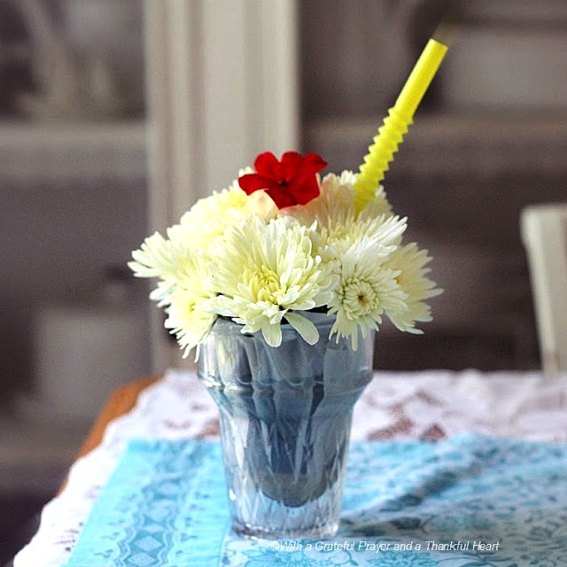 - Bunches of flowers like carnations or Mums ( pre-snipped the stems to about 4-inches long and had the foam in each glass. I could have let the kids do this themselves but for the sake of time and the littler ones, I did it ahead.