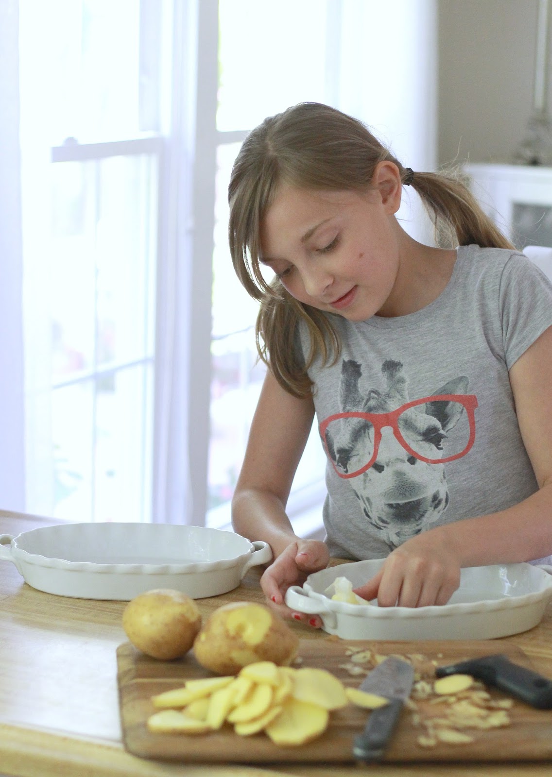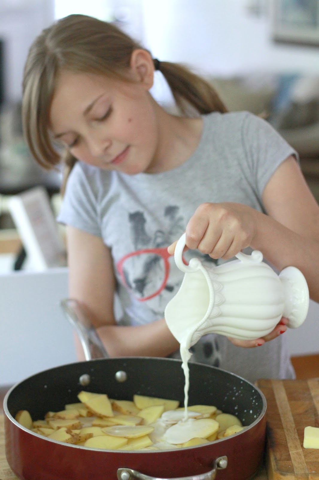 Peel the potatoes and wash in cold water. Do not let the potatoes soak in the water; it will remove the starch needed to thicken the milk. Slice the potatoes 1/4-inch thick into an 8-quart saucepan.
